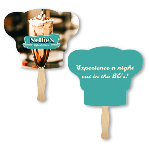 Clients are sure to get a kick out of this fun promotional product! Our full color sandwiched hand fans are expertly printed on 14 pt coated board stock paper. Great product for any indoor or outdoor event. A 8" basswood handle is attached in between the card stock with adhesive creating the custom Sandwich Hand Fan. These fans are printed full color on both sides and have a large imprint area. These mini billboards will cool you off while displaying your custom message. Excellent ad product for sports, games, trade shows, political & corporate events, fundraisers, churches, businesses, graduation, weddings, and parties.
