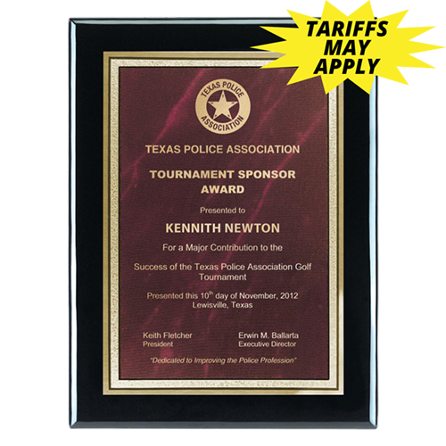 Product Specifications: Size: Plaque: 6" x 8", Plate 4" x 6" Weight: Material: Piano-Wood with marble plate Packaging: Packaged in presentation gift box. Prop 65: No Report Options: N/A Production: Normal production - 8 working days. For rush service - (click for details). Printing: Print Area: Plate: 3 1/2" x 5 1/2" Multi-color: N/A Method: Laser engraving. Available Vertical or Horizontal. Set-up Charge $30.00(v). Personalization $4.00(v) each. Print Colors: Gold |