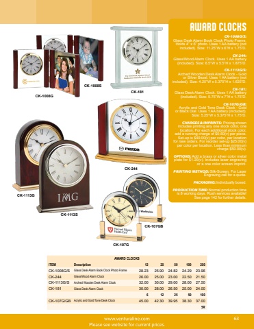 63AWARD CLOCKSITEM Description 12 25 50 100 250CK-1008G/S Glass Desk Alarm Book Clock Photo Frame 28.23 25.90 24.82 24.29 23.96CK-244 Glass/Wood Alarm Clock 26.00 25.00 23.00 22.50 21.50CK-1113G/S Arched Wooden Desk Alarm Clock 32.00 30.00 29.00 28.00 27.50CK-181 Glass Desk Alarm Clock 30.00 28.00 26.50 25.00 24.006 12 25 50 100CK-107G/GB Acrylic and Gold Tone Desk Clock 45.00 42.30 39.95 38.30 37.005RAWARD CLOCKSCK-1008G/S: Glass Desk Alarm Book Clock Photo Frame. Holds 4%u201d x 6%u201d photo. Uses 1 AA battery (not included). Size: 11.25%u201dW x 6%u201dH x 1.75%u201dD.CK-244: Glass/Wood Alarm Clock. Uses 1 AA battery (included). Size: 6.5%u201dW x 5.5%u201dH x 1.875%u201dD.CK-1113G/S: Arched Wooden Desk Alarm Clock - Gold or Silver Bezel. Uses 1 AA battery (not included). Size: 4.25%u201dW x 5.375%u201dH x 1.625%u201dD.CK-181: Glass Desk Alarm Clock. Uses 1 AA battery (included). Size: 5.75%u201dW x 7%u201dH x 1.75%u201dD.CK-107G/GB: Acrylic and Gold Tone Desk Clock - Gold or Black Dial. Uses 1 AA battery (included). Size: 5.25%u201dW x 5.375%u201dH x 1.75%u201dD.CHARGES & IMPRINTS: Pricing shown includes printing any one stock color, one location. For each additional stock color, add a running charge of $0.60(v) per piece. Set-up is $40.00(v) per color, per location for new orders. For reorder set-up $25.00(v) per color per location. Less than minimum charge $50.00(v).OPTIONS: Add a brass or silver color metal plate for $1.20(v). Includes laser engraving or a one color screen imprint.PRINTING METHOD: Silk-Screen. For Laser Engraving call for a quote.PACKAGING: Individually boxed.PRODUCTION TIME: Normal production time is 8 working days. Rush services available! See page 142 for further details.CK-1008GCK-1113GCK-1113SCK-107GCK-107GBCK-1008SCK-244CK-181