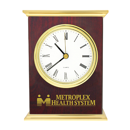 This Wood & Metal Desk Alarm Clock is a Great Award & Recognition, Executive or Corporate Gift! Elegant Piano-Wood Finish housing with Gold color bezel and color-matching Metal Top and Base. Use one AA Battery (not included).
