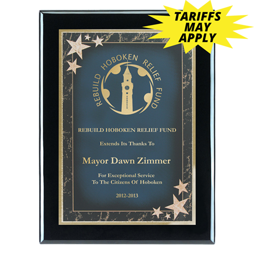 Product Specifications: Size: Plaque: 7" x 9", Plate: 5" x 7" Weight: Material: Piano-Wood Finish with Blue Plate Packaging: Packaged in presentation gift box. Prop 65: No Report Options: N/A Production: Normal production - 8 working days. For rush service - (click for details). Printing: Print Area: 3 1/2" x 5 1/2" Multi-color: N/A Method: Laser engraving. Available Vertical or Horizontal. Set-up Charge $30.00(v). Personalization $4.00(v) each. Print Colors: Gold |